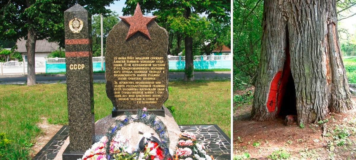 Подвиг пограничника Алексея Новикова, который, по легенде, на рассвете 22 июня 1941 г. спрятался в дупле большого дуба и невероятно долго вел огонь по врагу, — один из известных эпизодов начала войны на Брестчине. Публикация в 2011 году в России конверта с изображением Новикова тиражом 500 000 экземпляров демонстрирует актуальность легенды.