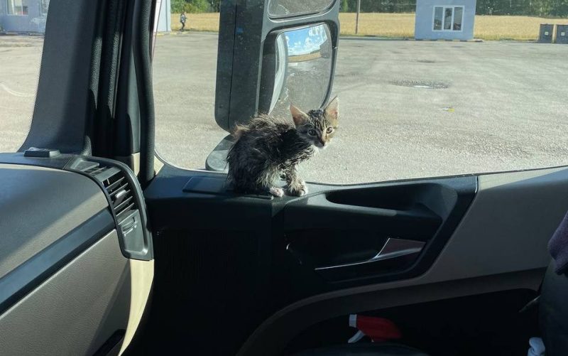 Жителю Барановичей Виталию Коновалику 36 лет. В середине сентября, находясь в очередном рейсе где-то между Уфой и Челябинском, он случайно увидел на заправке худую, ужасно голодную маленькую кошечку. Он пожалел ее, взяв с собой.