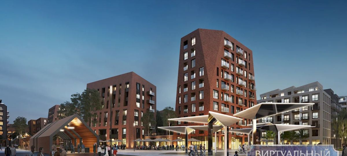 На рендерах — аккуратный, живой район с человеческим масштабом. В шаговой доступности здесь предусмотрены общественно-торговый центр, офисы, мини-рынок с площадью, выставочная галерея, многоуровневый паркинг, детский сад и пешеходный бульвар. Центральную часть квартала полностью освобождают от автомобилей.