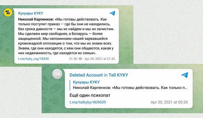 Так, 23 мая 2021 года под новостью телеграм-канала «Кулуары KYKY» о посадке самолета Ryanair с Протасевичем были написаны слова: «фашист», «террорист», «психопат» и другие.