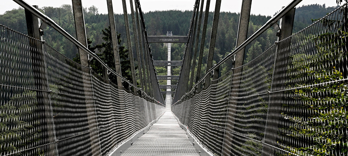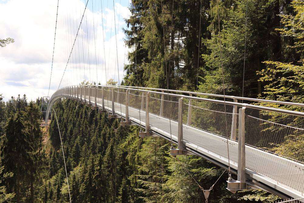 В начале июля на немецком горнолыжном курорте Виллинген, который расположен на севере земли Гессен (ее крупнейший город — Франкфурт-на-Майне), открылся один из самых длинных подвесных пешеходных мостов в мире. Его протяженность составляет 664 метра. Владельцы уверяют, что это самый длинный свободно висящий канатный мост в мире.
