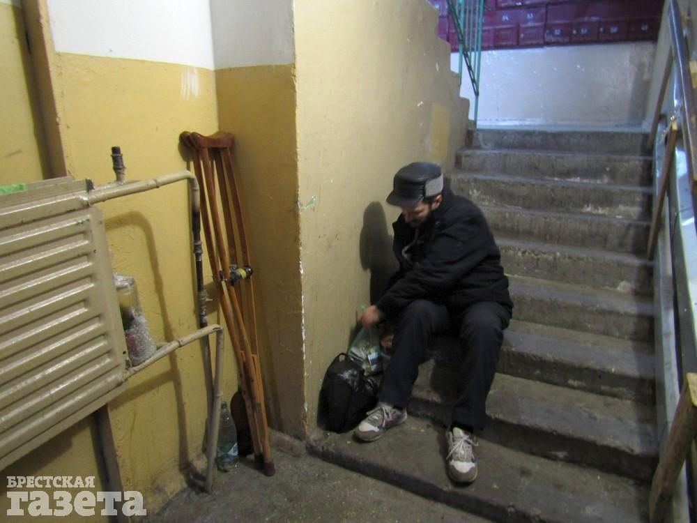 Всех, кто заходит в подъезд одного из домов на бульваре Космонавтов, на первом же лестничном пролете встречает мужчина. И это не консьерж и не швейцар. Вячеслав Ляшук здесь живет. Не в квартире этого подъезда, а именно на лестнице, которая ведет к квартирам. Спит, по его словам, прямо на бетонных ступеньках. Постель ему заменяет старенькое покрывало.