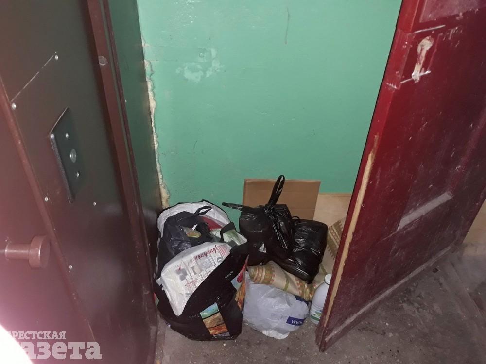 За дверью в тамбуре подъезда Вячеслав хранит все свое имущество: сумка с одеждой и обувью, пакеты с провизией, туалетные принадлежности, покрывало и еще что-то по мелочи.