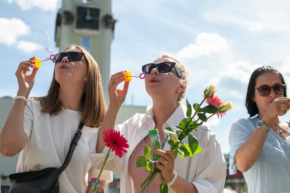Как и ранее в руках у многих цветы, белые или красные воздушные шары, плакаты с мирными лозунгами: «Остановите насилие», «Мы не овцы», «На самом деле нас еще больше», «Очистили улицы — очистите совесть». Им сигналили проезжающие автомобили.