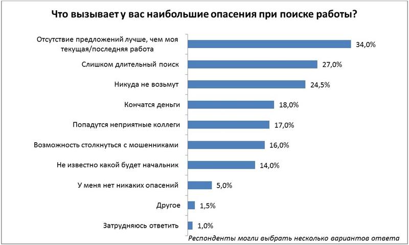 У соискателей есть повод для противоречивых эмоций. В первую очередь их пугает отсутствие предложений лучше, чем текущая работа (34%). 27% признались, что страшатся слишком длительного поиска.