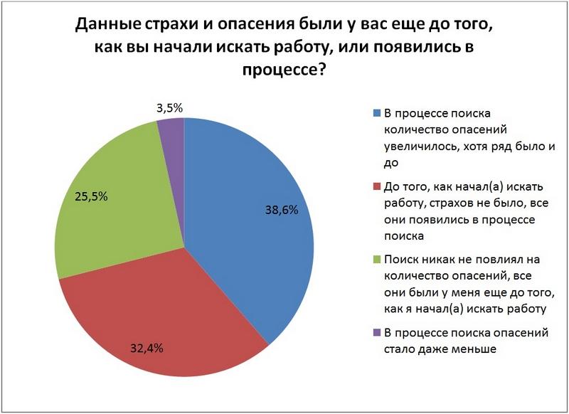 У большинства респондентов (71%) страхи и опасения появились либо увеличись непосредственно в процессе поиска работы. Четверть опрошенных отметили, что испытывали тревогу изначально. Лишь 3,5% рассказали о том, что во время поиска работы количество страхов стало даже меньше.