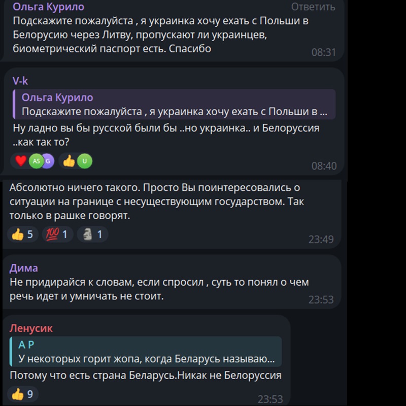 «Подскажите пожалуйста , я украинка хочу ехать с Польши в Белорусию через Литву, пропускают ли украинцев, биометрический паспорт есть. Спасибо».