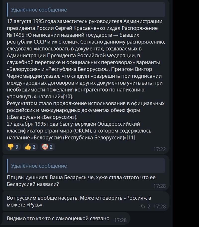 «Мне кажется вам в другой чат надо показывать знания истории. Если вас бесит слово Беларуссия, мне вас жаль».