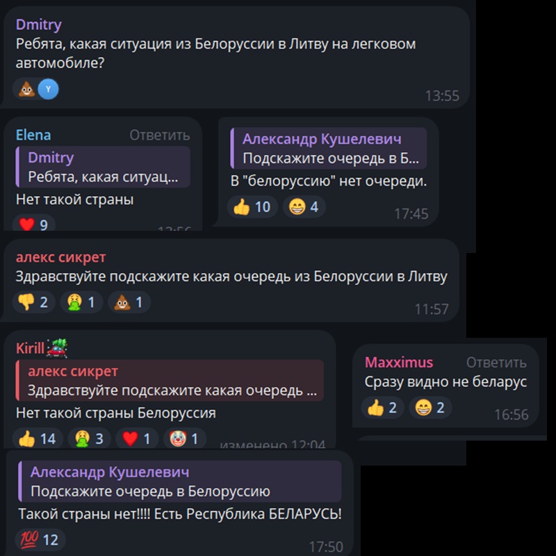 Суммарно в приграничных чатах, которые мы читаем, состоит более 120 тысяч человек. Больше всего там беларусов. Есть много россиян и украинцев. Встречаются также поляки и литовцы. Россиян обычно в чатах идентифицировать легко: они неправильно пишут название Беларуси и пункта пропуска «Тересполь». А самые смелые из них еще и объясняют беларусам, как правильно писать название нашей страны.
