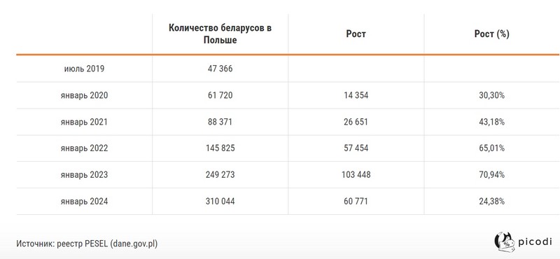 Аналитики Picodi.com изучили статистику польских государственных органов и посчитали, сколько беларусов могло переехать в Польшу в 2023 году. По их данным, за 2023 год в Польшу переехало 60 тысяч беларусов. А общее количество беларусов, проживающих в этой стране в начале 2024 года, оценивается экспертами в 310 тысяч человек.