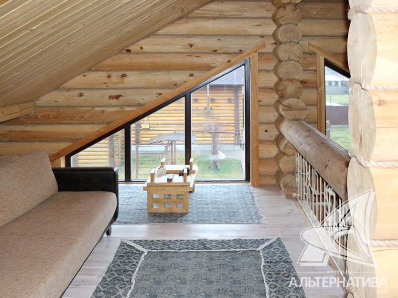 Дачный дом жилого типа с мансардой расположен в живописном пригороде Бреста. Просторный дом из профилированного бруса построен в стиле «русского терема». Общая площадь 146,12 кв.м., жилая – 68,51 кв.м.