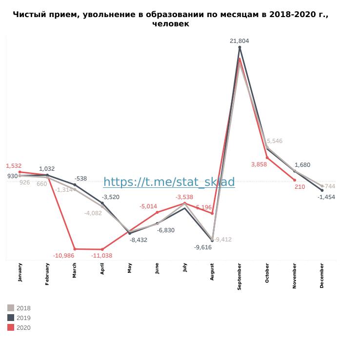 За прошедший год сфера образования Беларуси потеряла много кадров. Исходя из данных Белстата, чистых увольнений в 2020-м насчитывается свыше 9 000. Это больше, чем суммарно за 2019 и 2018 годы. По мнению аналитика проекта «Кошт Урада» Дмитрия Ивановича, такая динамика связана с пандемией, а также ситуацией с информационным сопровождением и наличием средств индивидуальной защиты в школах.