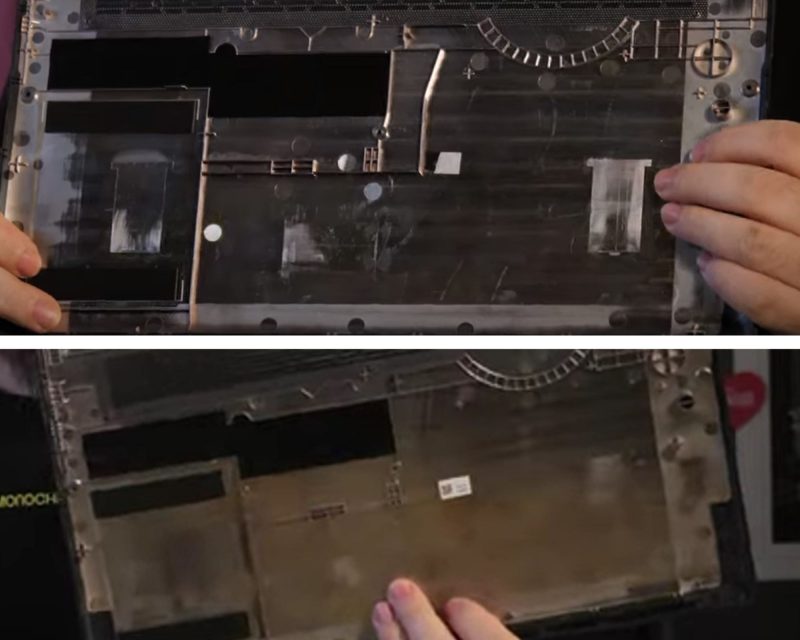 Сравнение нижней крышки двух ноутбуков. Сверху — от H-book, снизу — от китайского ноутбука. Скриншот видео