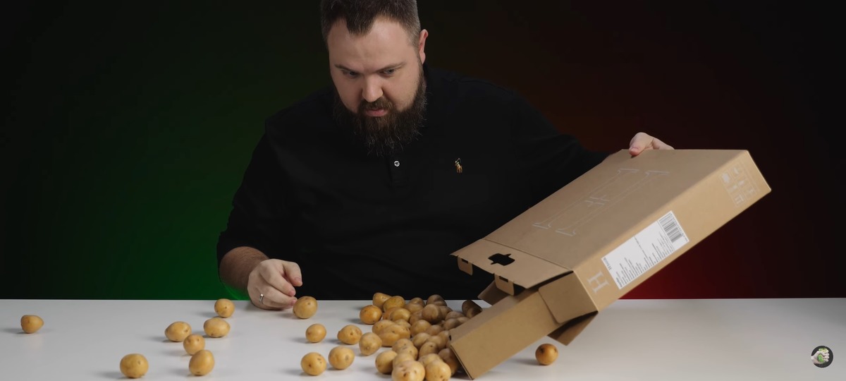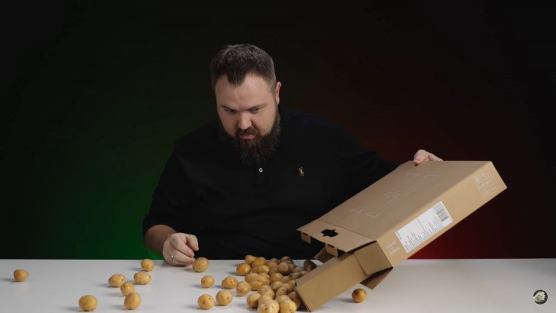 В самом начале обзора Wylsacom открыл картонную упаковку «беларуского» ноутбука и из нее на стол высыпалась картошка.