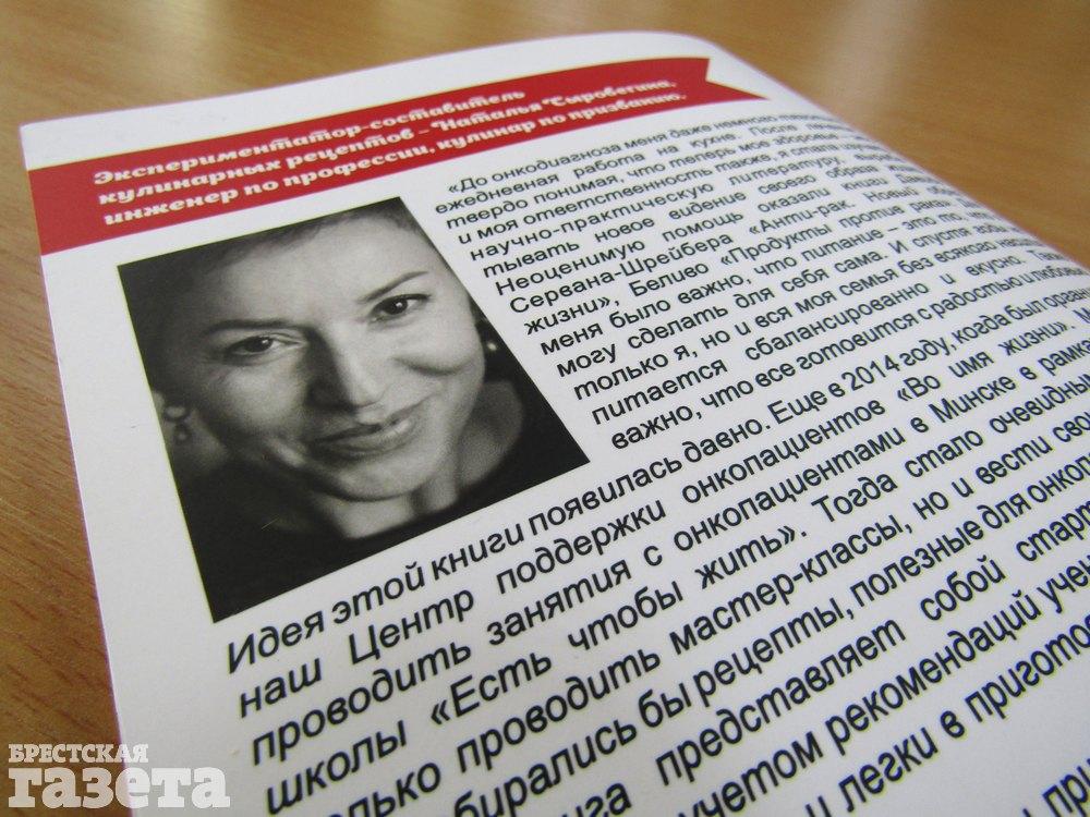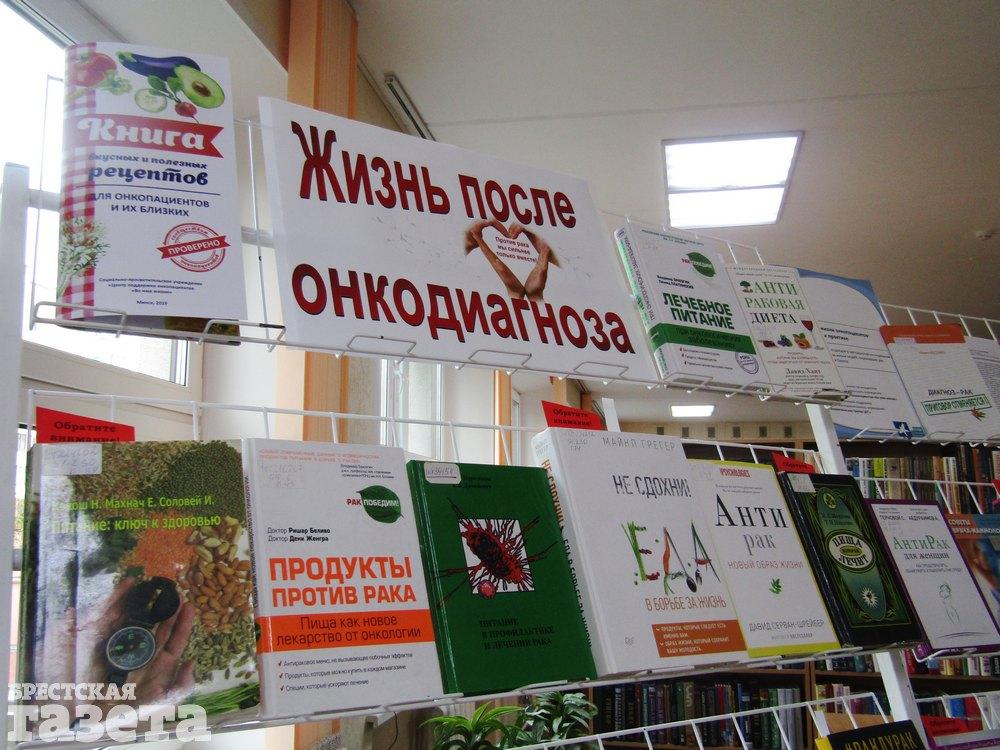 9 октября в Брестской областной библиотеке им. М. Горького презентовали «Книгу вкусных и полезных рецептов для онкопациентов и их близких», изданную Центром поддержки онкопациентов «Во имя жизни». Презентация прошла в очень узком кругу. Только отдельные люди в Бресте пока готовы открыто говорить о своем опыте борьбы с онкологией. Руководитель Центра Ирина Жихар, заместитель главного врача Брестского областного онкодиспансера Наталья Макар и онкопациенты, участвующие в фотомарафоне «Мы можем. Я могу» для женщин, которые столкнулись с онкологией, поделились знаниями и опытом о правильном питании и образе жизни, которые могут сыграть решающую роль в противостоянии организма болезни.