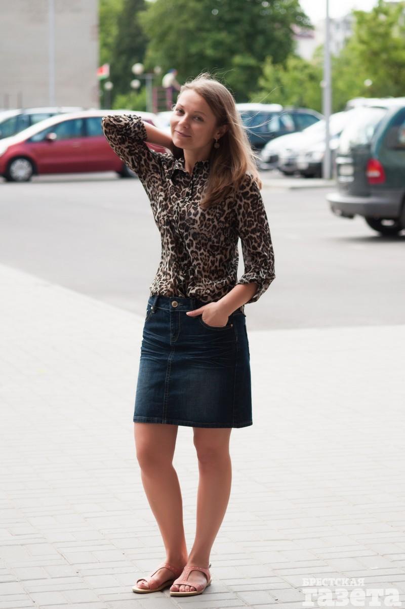 Валентина предпочитает пастельные тона, но специально для «БГ» решила поэкспериментировать. Выбрала легкую рубашку с леопардовым принтом и простую джинсовую юбку, чтобы уравновесить «хищный» верх.