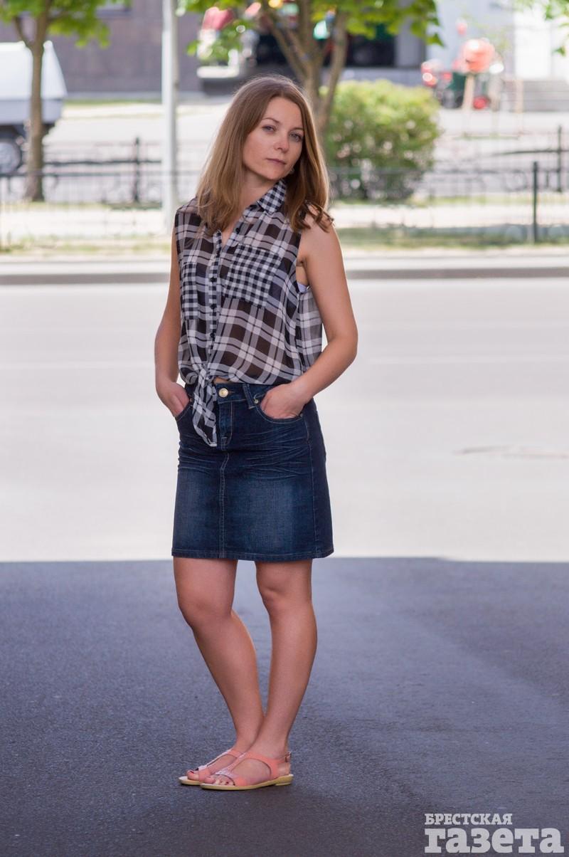 Приглянулась нашей героине и клетчатая блузка без рукавов. Это более характерный для нее вариант, поэтому решено было сфотографировать комплект с блузкой и той же джинсовой юбкой.