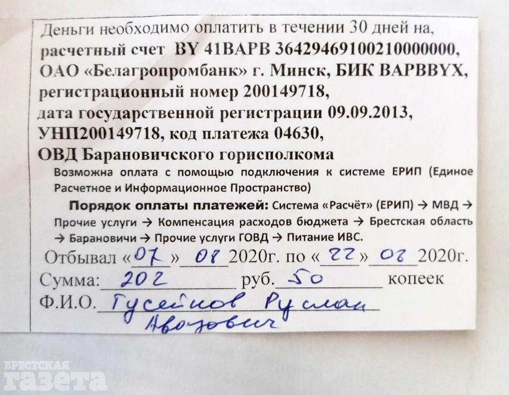 Руслана Гусейнова поместили в ИВС Пинского ГОВД. По его словам, сотрудники изолятора относились к нему нормально: выдали постельное белье, водили в туалет по необходимости и даже разрешали помыться. В первый день он был в камере один, на следующий день к нему «подселили» доверенное лицо экс-кандидата в президенты Светланы Тихановской по Пинскому региону Валерия Романовича.