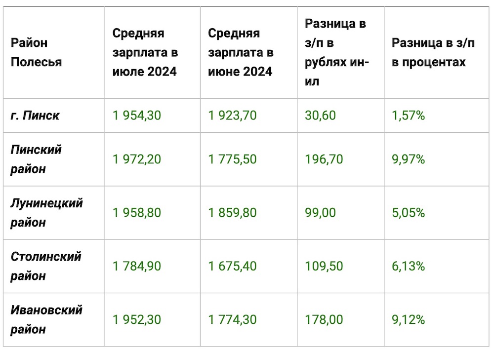Наибольшую месячную прибавку получили в Пинском районе: зарплаты увеличились на 197,7 BYN. На втором месте — Ивановский район с увеличением зарплаты на 178 BYN по сравнению с прошлым месяцем. Тогда зарплата упала на 35,2 BYN.