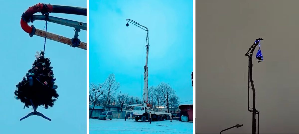 В Бресте появилась, пожалуй, самая креативная новогодняя елка этого сезона. Ее установили (или все-таки подвесили?) на высоте около 32 метров над уровнем города, закрепив на стреле бетононасоса.