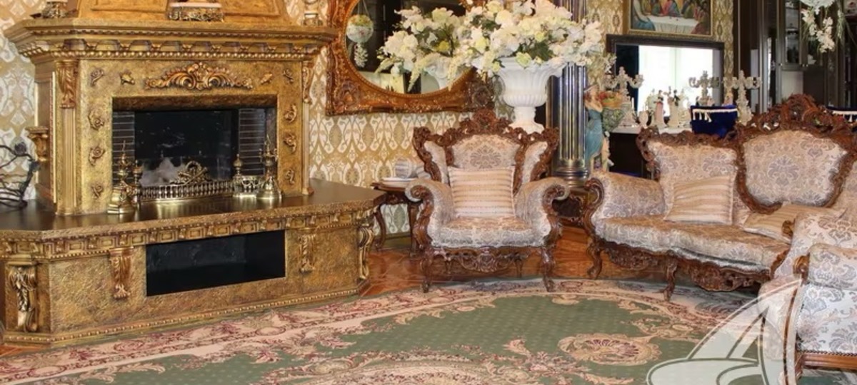 Золотой камин окружает не менее помпезная мебель в лучших традициях жанра. Позолота и шелк, вензеля, ковры и канделябры, зеркала в тяжелых рамах… Судя по основному цвету интерьера, автор задумки явно симпатизирует царю Мидасу.