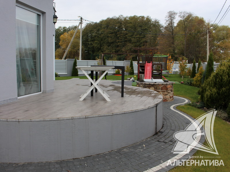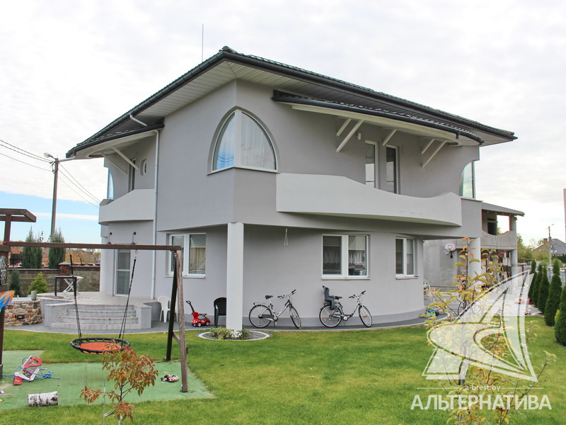 Материал стен – стружечная плита и железобетонные панели. Дом утеплен пенополистиролом, а фасад отделан штукатуркой «американка». Кровля выполнена из металлочерепицы, окна ПВХ. Общая площадь – 357,2 кв.м, а жилая 73,86 кв.м.