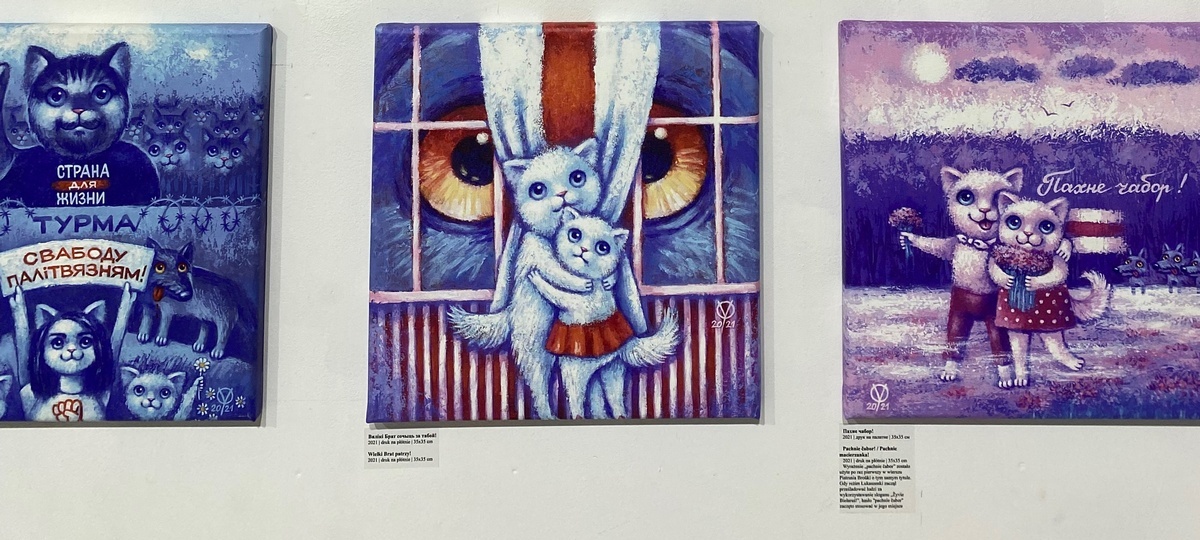 Кроме знаменитой серии работ «Коты свободы», на выставке можно увидеть серию картин «Ангелы» и работы, посвященныеУкраине. В некоторых изображениях котиков, беларусы узнают своих героев – Светлану Тихановскую, Виктора Бабарико, Алеся Беляцкого, Максима Знака и других.