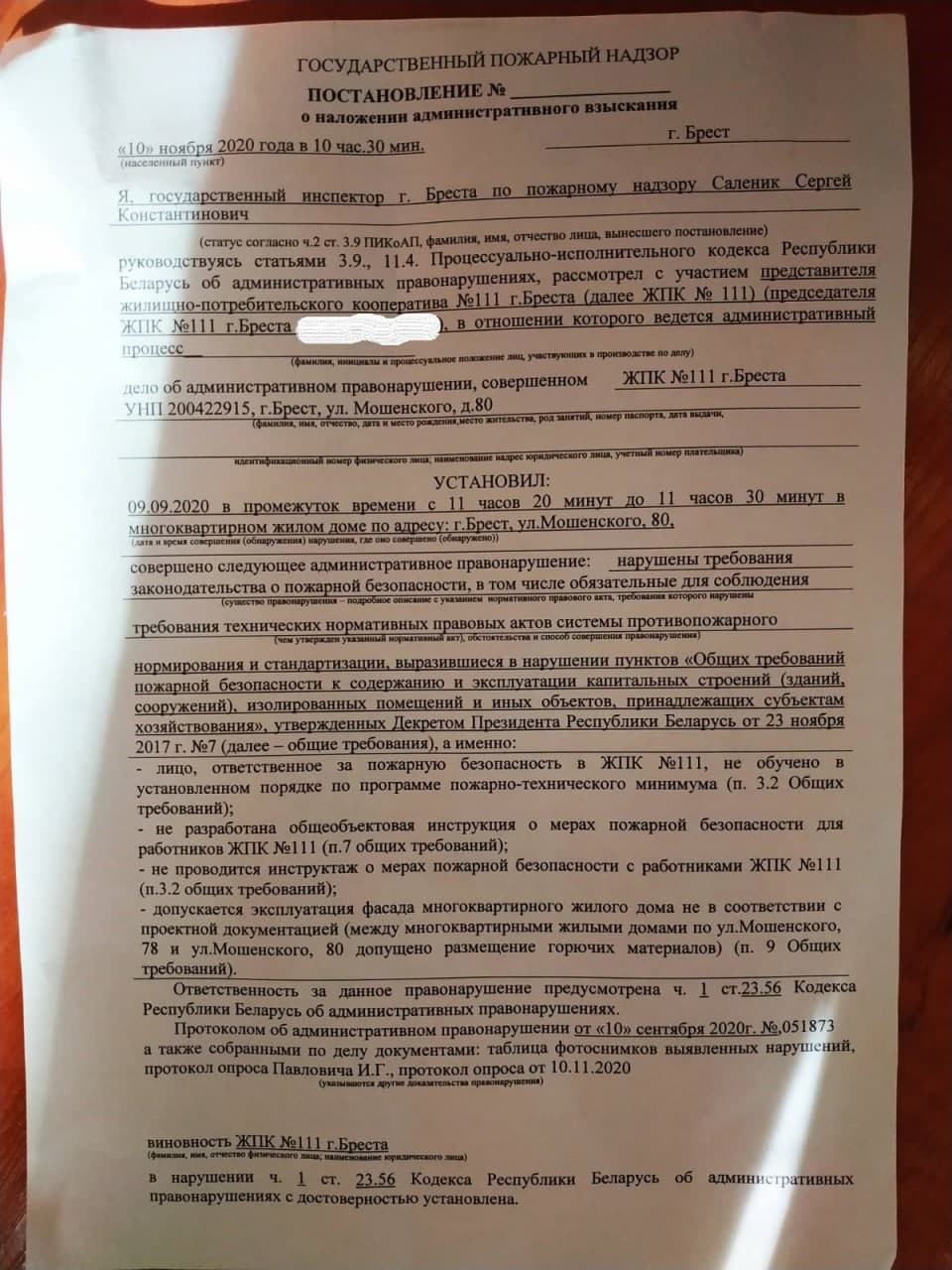 Но оказалось, что 24 сентября сотрудники ГОЧС выписали постановление со штрафом 30 базовых (810 рублей) на председателя. Сам ЖПК оштрафовали на 200 базовых (5 400 рублей) за те же нарушения, что и председателя, плюс за эксплуатацию многоквартирного дома не в соответствии с проектной документацией. Не соответствие с документацией – это национальный флаг, висевший между домами на Мошенского.