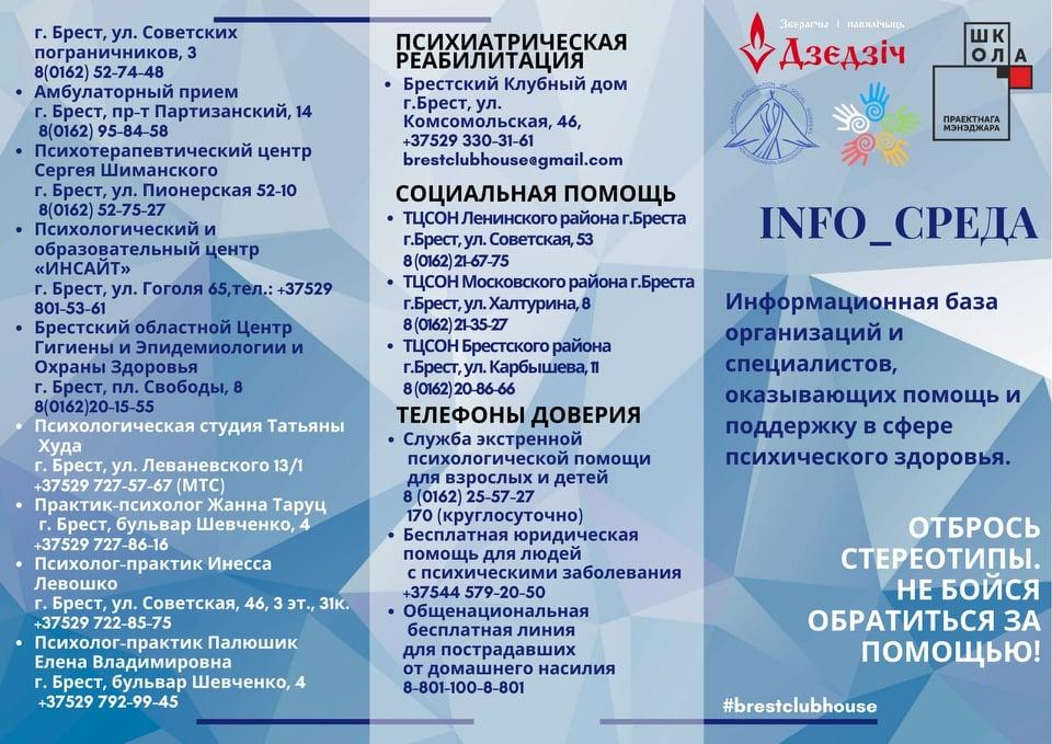 «В последнее время мы столкнулись с тем, что к нам приходят люди и просят посоветовать, к какому обратиться специалисту, – рассказала Таня. – Мы поняли, что в Бресте отсутствует единая база специалистов. Поучаствовав в школе проектного менеджмента от агентства регионального развития «Дзедзіч», мы разработали проект «Инфосреда».