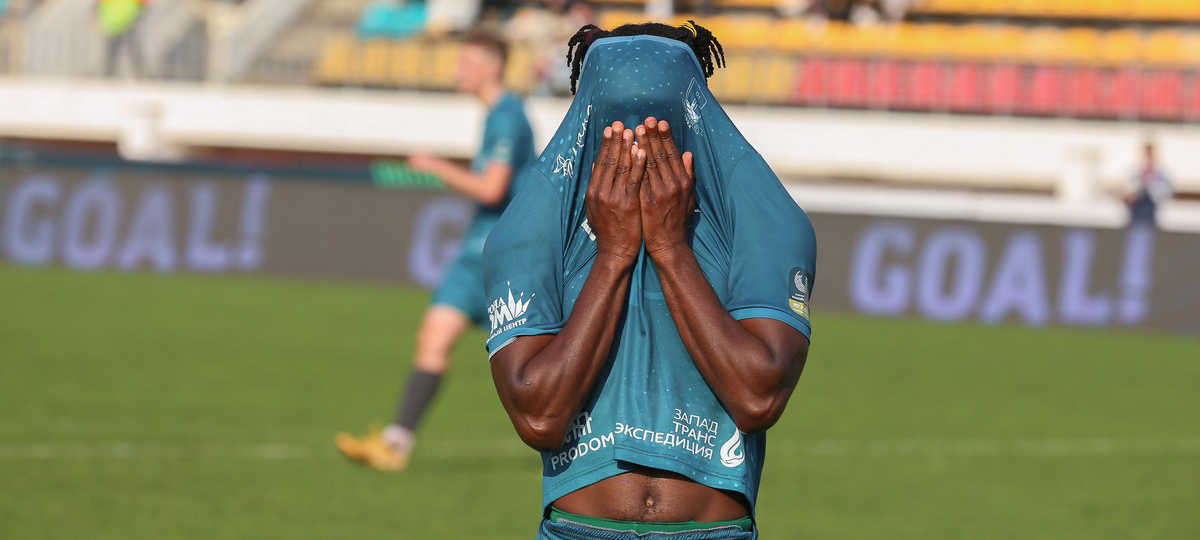 Но забивали исключительно футболисты «Руха». На 65-й минуте Дэвид Твэ убежал один на один с голкипером и пробил прямо в него, но мяч отскочил к Денису Лаптеву, который в касание пробил в пустые ворота, оформив хет-трик.