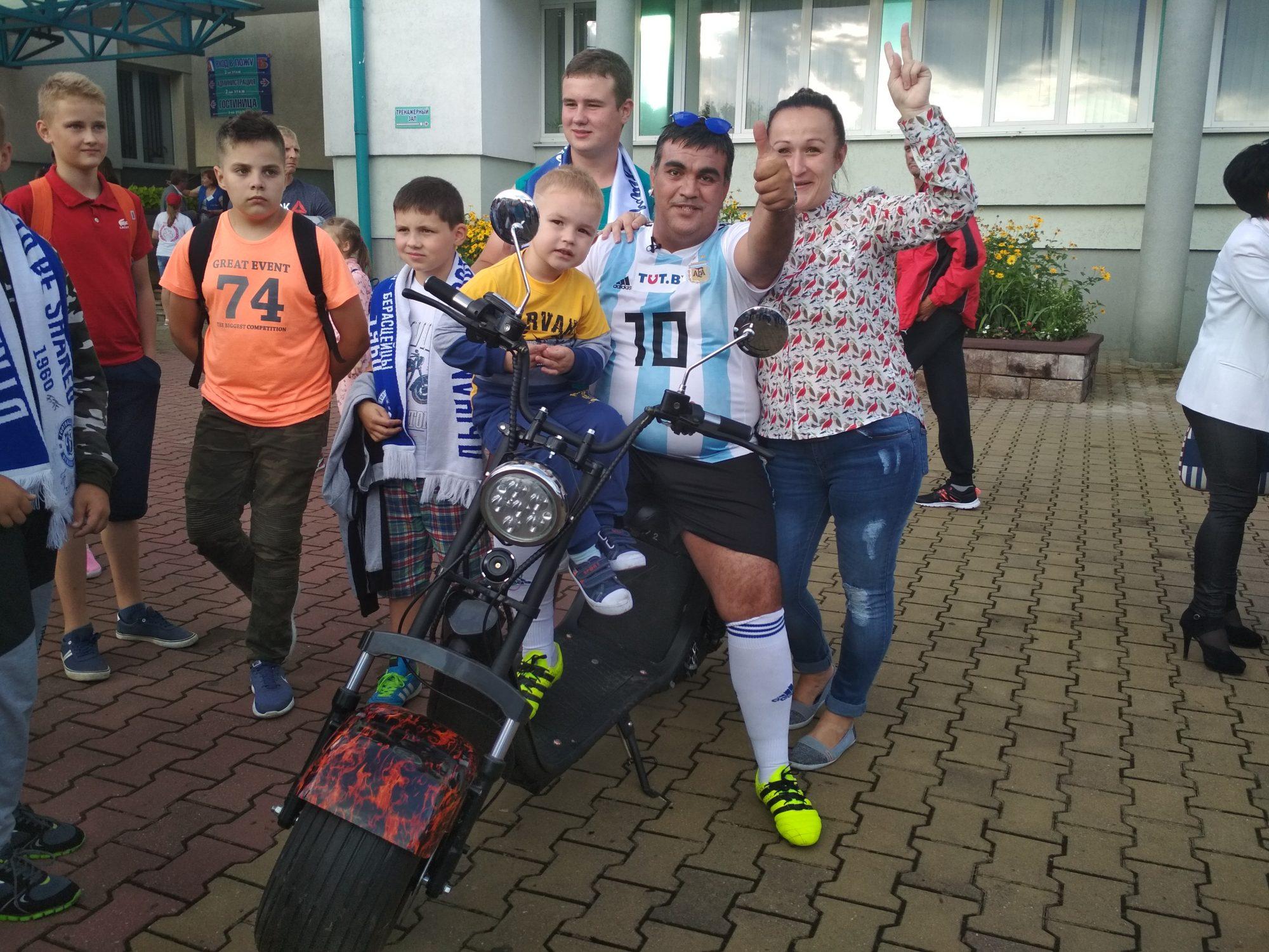 Задолго до начала игры зона гостеприимства стала заполняться многочисленными компаниями друзей, парами, семьями любителей футбола. В этот день они ждали на территории развлечений спорткомплекса чего-то особенного. И дождались! На одном из выставочных мотоциклов корреспондентом «БГ» был замечен мужчина в бело-голубой полосатой майке с номером 10 на спине.